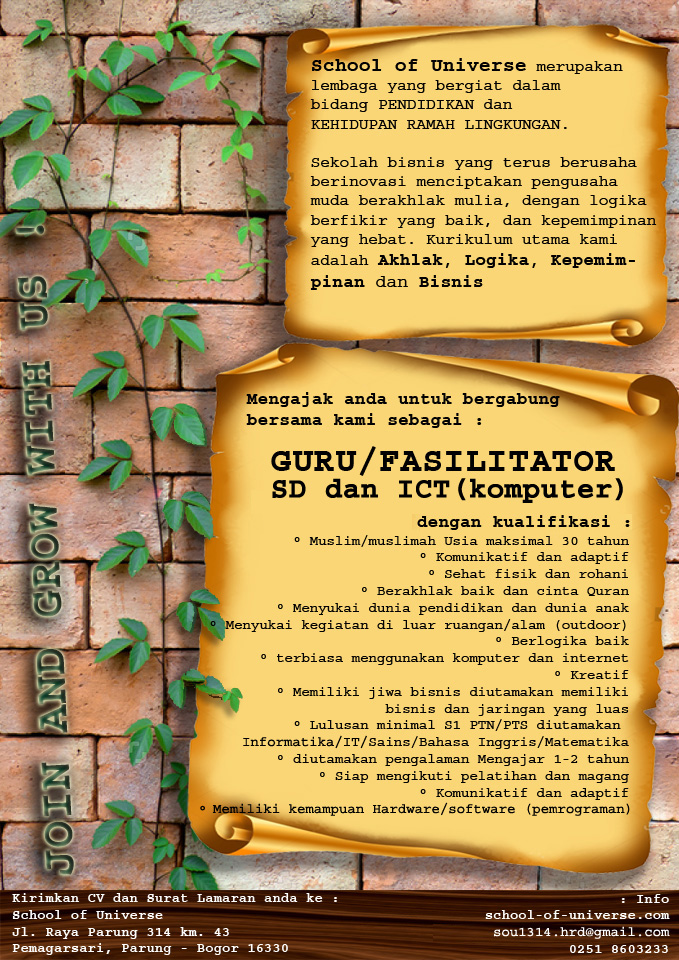 Untuk tahun ajaran 2018/2019, School of Universe mengajak anda untuk bergabung bersama kami sebagai Fasilitator SD dan Fasilitator ICT (komputer). Bagi anda yang memiliki kualifikasi yang kami syaratkan, silahkan mengirimkan aplikasi kepada HRD School of Universe paling lambat 30 Juni 2018. kami tunggu yaa..