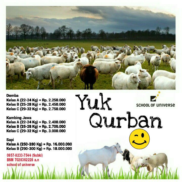 Pemotongan hewan qurban akan dilaksanakan pada hari Kamis, 23 Agustus 2018. Kegiatan ini juga melibatkan partisipasi siswa-siswi School of Universe. Bagi ayah bunda yang ingin memesan hewan qurban, School of Universe juga menfasilitasi pengadaan hewan qurban dengan harga yang sangat bersaing.