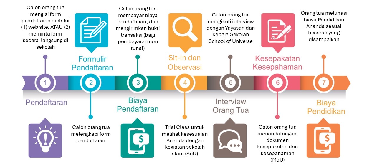 Ayah dan Bunda, mulai Bulan September 2025 School of Universe kembali membuka kesempatan bagi ananda yang ingin bergabung pada tahun ajaran 2026-2027 yang akan datang. Kami membuka pendaftaran untuk Playgroup, Kindergarten, Elementary dan highschool. Untuk Informasi dan pendaftaran silahkan menghubungi School of Universe melalui web pendaftaran online, telepon 0251 8603 233, whatsapp di nomor 0856 8080 868 atau email kami di dan . Pendaftaran kami buka dalam 3 gelombang, Gelombang pertama berakhir pada 31 Oktober 2025, Gelombang kedua 1 November 2025 hingga 31 Desember 2025, dan gelombang ke tiga 1 Januari 2026 hingga 31 Maret 2026. Pastikan untuk segera melakukan pendaftaran agar mendapatkan potongan biaya dan memperoleh quota kelas yang tersedia.